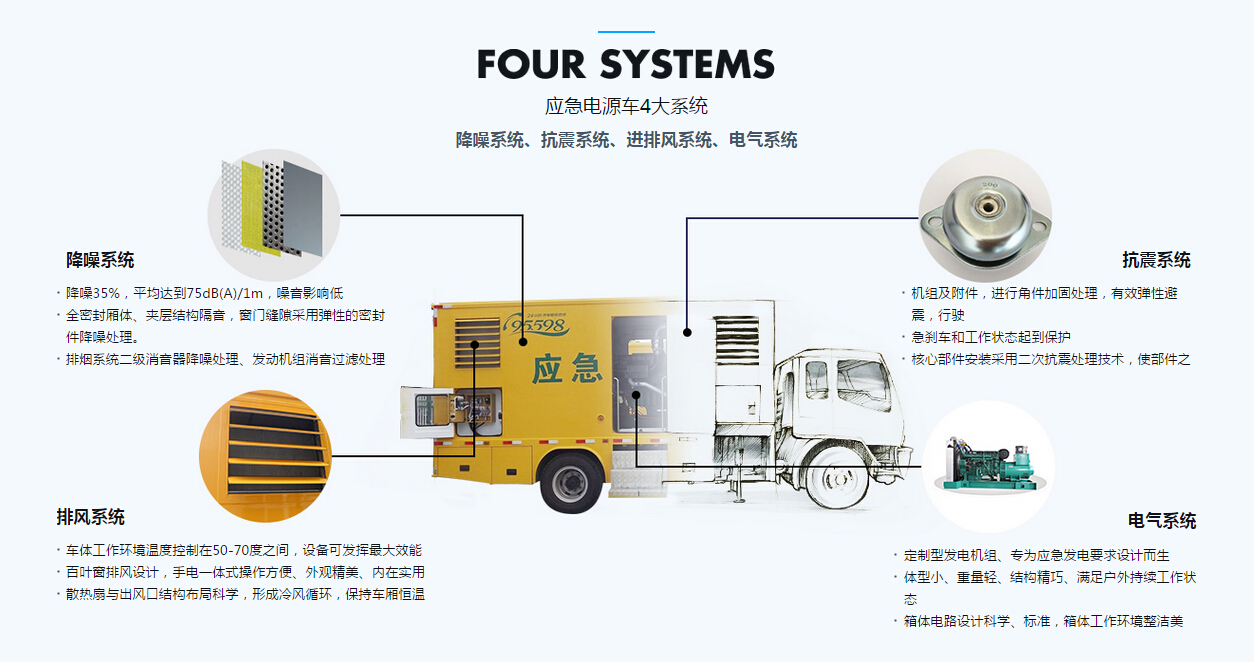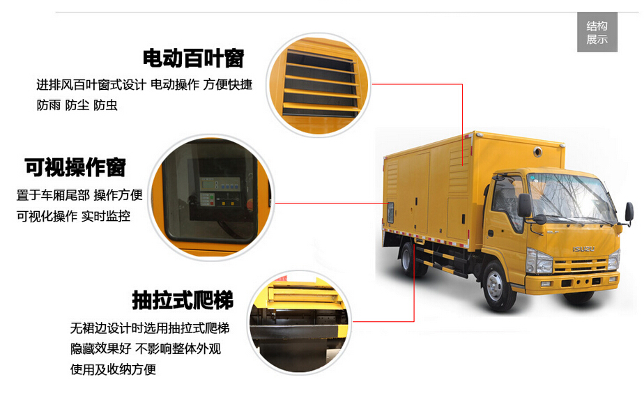 移動電源車由二類汽車底盤,靜音廂體,柴油發(fā)動機(jī),發(fā)電機(jī)組,控制系統(tǒng),內(nèi)外照明裝置,輸配電裝置,電纜卷盤,電源輸入,輸出接口,液壓支腿等構(gòu)成。